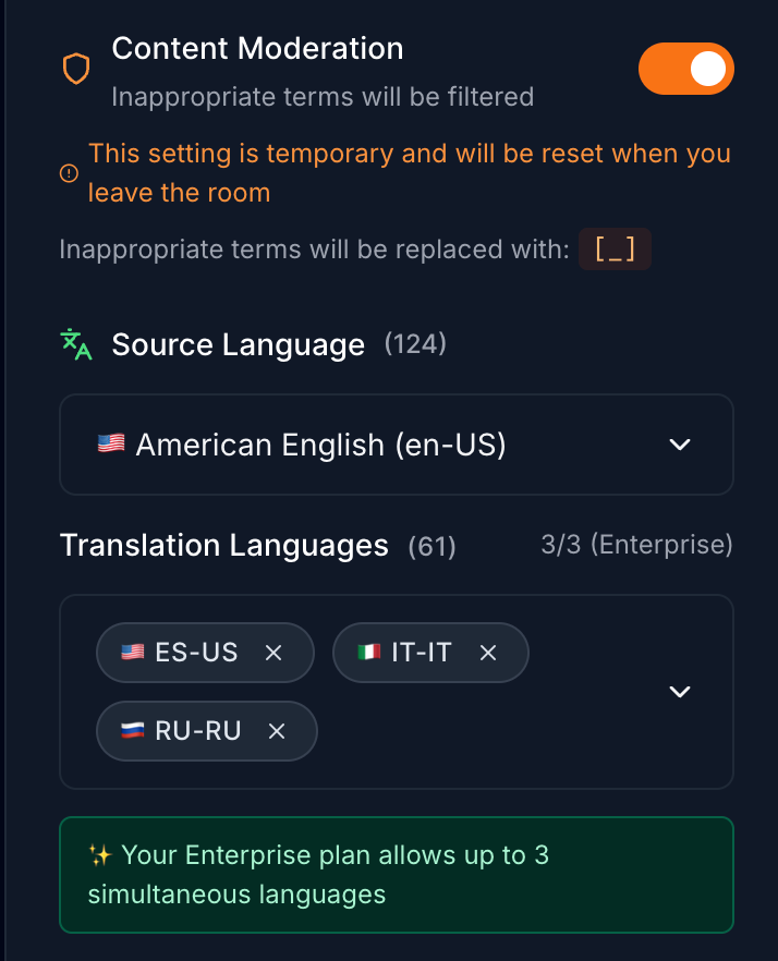 Within seconds, your event becomes multilingual — naturally and automatically.