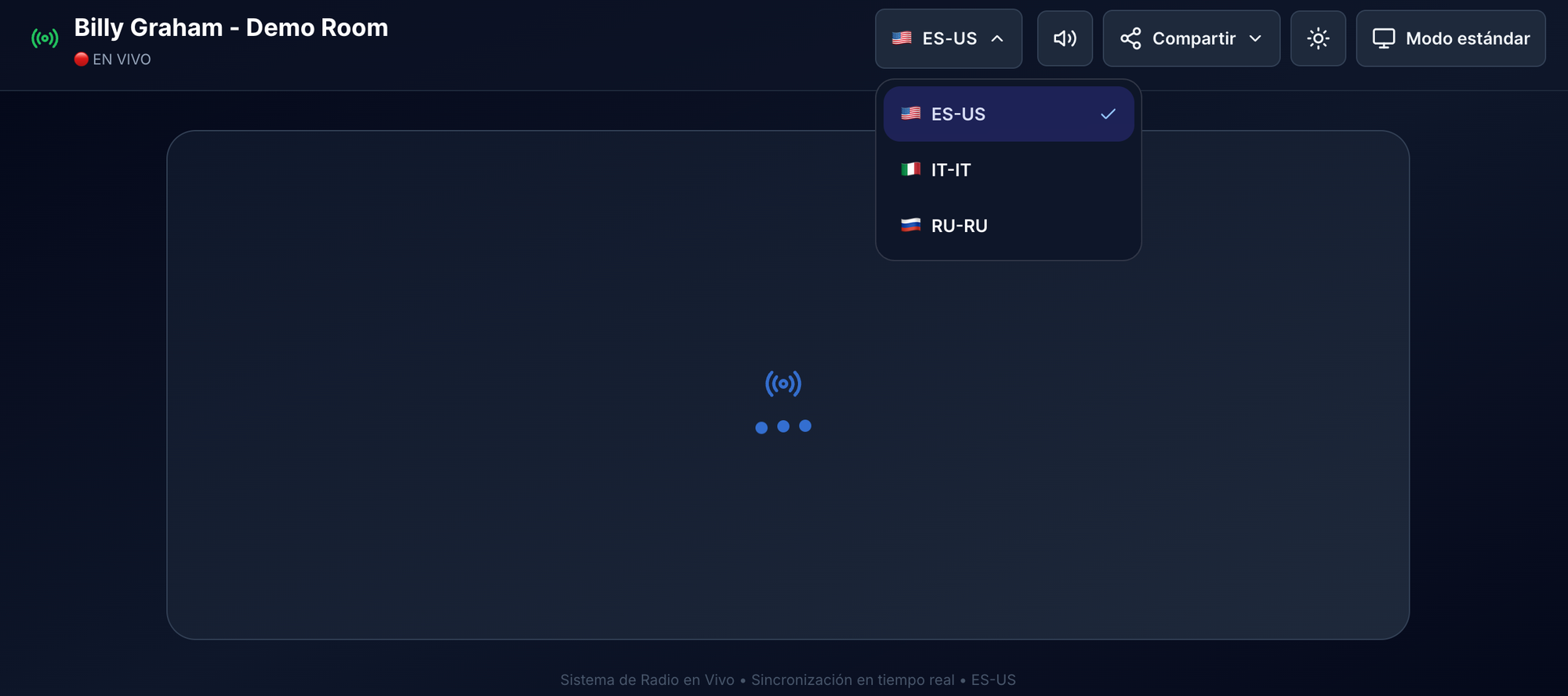 - Distribution to listeners: Participants open the public player on their phones and select their language.