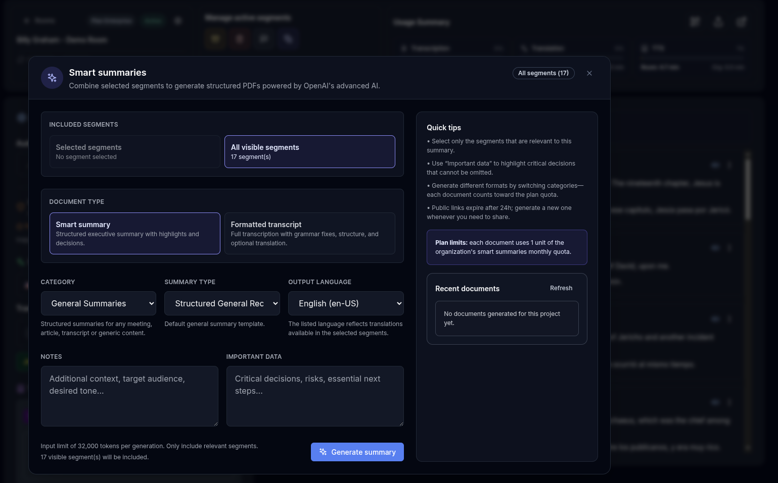AI-powered summarization addresses exactly this gap: it transforms long, dense recordings into concise, usable documents that people actually read and act upon.
